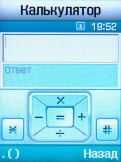 Мировое время также позволит скоротать пару минут. Не более чем игрушка. Но иногда полезно. Будильник, Таймер и Секундомер не предлагают ничего нового. Калькулятор чрезвычайно эргономичен. Математические действия запрограммированы на 4 стороны четырехпозиционной навигационной клавиши. Кроме того, есть возможность совершать сложные операции с помощью скобок. Мощный Конвертер позволит не только перевести сумму из одной валюты в другую, но и сориентироваться в мире длин, весов, объемов, площадей и температур в различных единицах и системах измерения.