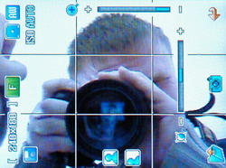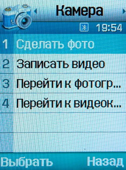 Эффекты включают черно-белый, сепию, рельефный, эскиз (а-ля карандаш), старинный, лунный, туманный. Имеется 27 рамок, которые можно тут же наложить на снятое изображение, возможность настроить Автоспуск на 3, 5, 10 секунд и настроить Разрешение снимка в пределах от 240х180 до 1280х1024 пикселей. Замер экспозиции доступен точечный, матричный и центровзвешенный. Баланс белого выставляется одним из предустановленных режимов: помещение, лампа накаливания, флуоресцентная лампа, облачно, закат, автомат. При включении камеры посредством навигационной клавиши доступна регулировка контрастности и степени увеличения изображения.