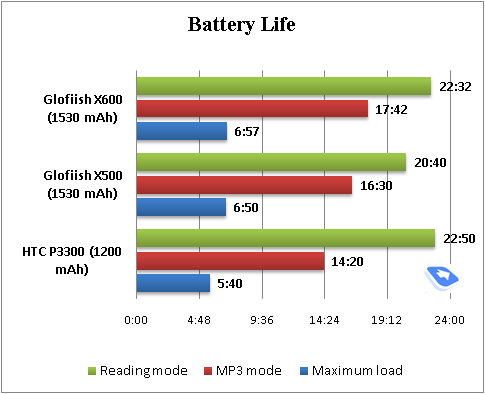 Съемная Li-Ion батарея у модели glofiish X600 имеет емкость 1530 мАч. Для устройств от E-Ten это стандартный аккумулятор, используемый во всех аппаратах. В случае X600 аккумулятор модели полностью совместим с аккумулятором glofiish X500, они взаимозаменяемы. Значения времени автономной работы также во многом сравнимы. В данном случае с показателями glofiish X500.