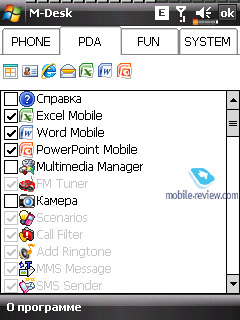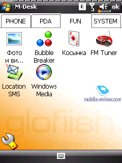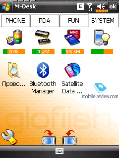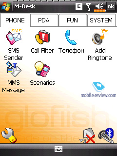 Это в меру красивая и приятная (хотя и слишком пестрая) оболочка для быстрого доступа к программам, настройкам. Внутри оболочки приложения разделены по вкладкам: Phone, PDA, Fun, System. В любую вкладку вы можете добавлять любое количество программ или удалять их. Иконки программ, а также вкладки, сделаны большими по размеру, что позволяет работать с программой без использования пера. Запускать программы можно с помощью пальца.