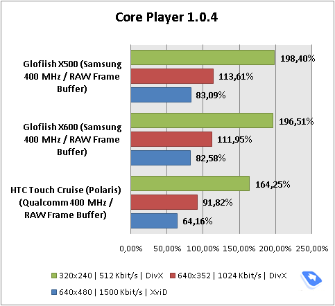Обратимся к результатам тестирования в проигрывателе Core Player, это наиболее приближенный к реальности тест. Напомним, что результат, равный 100%, говорит о том, что видео в указанном разрешении и качестве будет проигрываться на устройстве без заметных «притормаживаний», выпадение кадров возможно лишь в динамичных сценах. Значение выше 120-130% означает, что мощности аппарата хватит для безупречного (без зависаний и выпадения кадров) проигрывания видео указанного разрешения и качества.