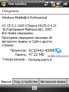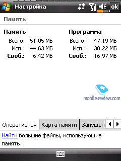 Объем доступной для работы операционной системы оперативной памяти равен 47 Мб (из 64 Мб). Из этого объема около 23-25 Мб занято сервисными процессами для работы ОС, для запуска программ остается примерно 23-24 Мб. Из 128 Мб установленной flash-памяти (в ней хранятся все пользовательские данные) пользователю доступно примерно 50-51 Мб (в зависимости от прошивки). При этом после первого запуска примерно 20 Мб отнимают программы первой установки (дополнительное ПО от E-Ten), так что для использования остается примерно 28-30 Мб. Заметим, что никто не мешает вам сразу после запуска удалить все дополнительные приложения или те, которые вы не используете, и освободить 20-25 Мб памяти.