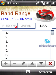 FM-радио – для прослушивания радио используется приложение FM tuner. Диапазон допустимых частот для программ впечатляет. Всего присутствует три вкладки-диапазона: Europe (87.5 – 108.0), Japan (76.0 – 90.0) и USA (87.5 – 107.9). В каждой вкладке можно сохранить до 50 радиостанций с возможностью редактирования. Для радио доступна функция отключения экрана, при этом трансляция с радиостанции будет продолжаться.
