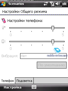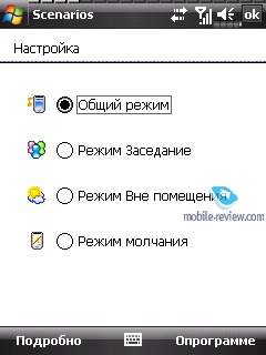 Scenarios – при помощи этой утилиты можно настроить профили. Всего доступно четыре профиля. Для каждого можно настроить громкость звонка, силу вибрации, а также уровень экранной подсветки. Как уже говорилось выше, для быстрого доступа к профилям значок программы можно вывести на экран «Сегодня», в нижнюю часть.