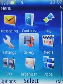Меню. Для вызова меню служит центральная клавиша джойстика, она же, при необходимости, позволяет активировать блокировку клавиатуры. Главный экран меню представляет собой матрицу 3 х 3, анимации нет, но при удержании курсора на определённой иконке выводится справка о назначении того или иного раздела. На рабочий стол можно ставить обои или наиболее часто используемые иконки.