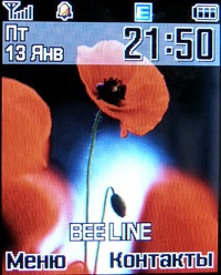 Элементом дизайна также является и внешний монохромный дисплей. Его наличие, на мой взгляд, обусловлено тем, что монохромные экраны смотрятся всё же более стильно, чем блёклые цветные, так как качественных внешних цветных экранов мне ещё не встречалось. Разрешение внешнего экрана у Е500 составляет 80 х 56 пикселей, по словам производителя, он способен отображать до 65000 цветовых оттенков. Верхняя часть внешнего экрана постоянно отображает время, дату и служебную информацию телефона, а вот на нижнюю можно поставить заставку в виде часов или какое-нибудь изображение.