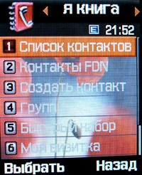 Меню в телефоне старой версии: иконки могут отображаться только в виде матрицы, а подменю отображаются в виде списков. Зато в настройках можно выбрать различные цветовые режимы для фона меню и стиля текста при наборе номеров. Порадовало наличие расширенной адресной книги на 1000 номеров. В телефоне также имеется почтовой клиент POP/IMAP4 с поддержкой пяти ящиков, но, увы, он плохо различает некоторые кодировки.