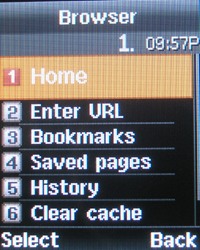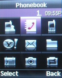 Меню в J600 стандартно для большинства современных корейских аппаратов: оно может иметь вид матрицы или списка и может быть представлено в белом или чёрном цвете. Главное меню состоит из 9 иконок, среди которых встречается и поисковик Yahoo!