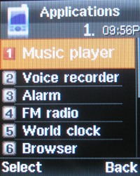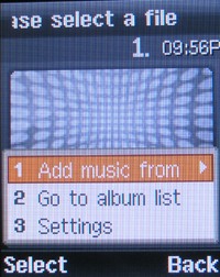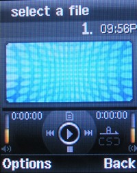 Из возможностей плеера стоит отметить случайный режим воспроизведения, повтора и два типа визуализации при воспроизведении. Музыка может храниться как на карте памяти в специальной директории, так и в памяти телефона, хотя места в нём совсем немного - 20 Мб динамически распределяемой памяти. Однако аппарат поддерживает работу с карточками памяти MicroSD объёмом до 2 Гб, так что телефон можно с лёгкостью использовать для хранения данных или в качестве плеера. Впрочем, с последней задачей он справляется на не самом высоком уровне и может послужить заменой лишь недорогому MP3-проигрывателю. Громкость в плеере имеет 14 градаций; слушать музыку можно в метро и других шумных местах.