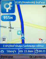 С программой аппарат справляется довольно сносно: иногда она подтармаживает, но в целом Nokia Maps не показывает признаков тяжелой флегматичности. Запас производительности процессору не помешал бы, но и с этим чипсетом аппарат работает приемлемо. Кстати, за все время тестирования GPS-навигатора (около двух недель), Nokia N95 ни разу не пожаловалась на отсутствие свободной оперативной памяти. Небольшая хитрость: если вы не хотите закрывать приложение, но вам надо, например, позвонить или набрать SMS, то нажмите кнопку "Меню" (большая прямоугольная клавиша слева от "навигационки") и тогда приложение автоматически свернется. При возврате в него все данные будут сохранены. Почему-то производитель не сделал пункт "Свернуть" в меню Nokia Maps.
