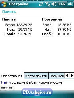 Количество оперативной памяти стандартное для новых моделей – 64 Мб. Зато объем памяти для хранения данных радует – 256 Мб против 128 в большинстве современных моделей. После первого запуска и конфигурации (установка программ из набора RoverPC, загрузки в память системных файлов) для запуска программ остается около 18-20 Мб оперативной (RAM) памяти. Из 256 Мб после первого запуска остается примерно 100 Мб доступной для установки программ памяти.
