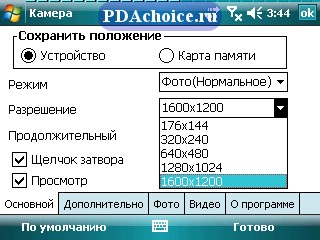 В настройках фото на выбор доступны несколько разрешений (176x144, 320x240, 640x480, 1280x1024, 1600x1200). Также можно выбрать качество снимков (хорошее, лучшее, отличное), баланс белого (авто, солнце, облака, помещение, люминесцент) и эффекты (негатив, черно-белое, сепия, синий, красный, зеленый снимок).