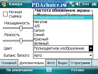 Помимо основных параметров можно изменить насыщенность, резкость, яркость и контрастность изображения, а также выбрать один из режимов съемки (фото, фото с рамкой, фото для MMS).