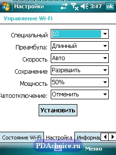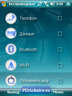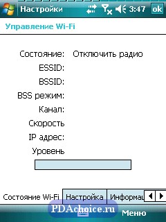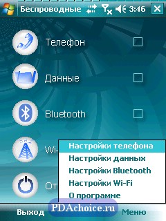 Модуль WiFi имеет версию 802.11b/g. Для этого интерфейса в коммуникаторе есть специальная программа, которая позволяет изменять мощность передатчика в зависимости от разных условий, и тем самым экономить заряд батареи.