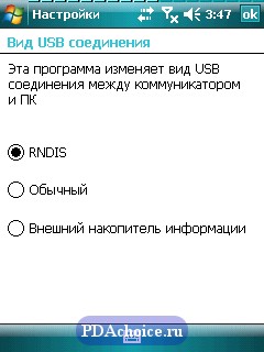 Для подключения к компьютеру предусмотрено несколько режимов. Стандартный, RNDIS (если ПК не определяет устройство через стандартный режим), а также режим, в котором память коммуникатора видна как flash-память.