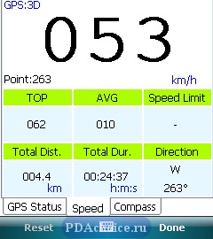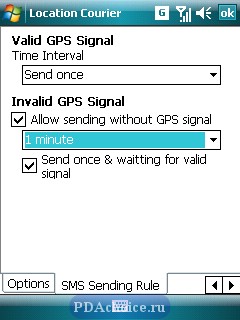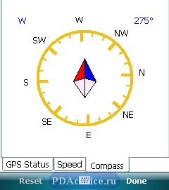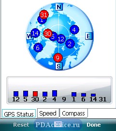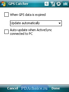 В запущенном состоянии программе регулярно необходимо обновлять GPS-информацию через Интернет,, такую как состояние спутников, точное время и дату для определения их положения и др. В настройках есть всего два пункта: 1) Действие в случае, когда у данных истечет срок актуальности: показывать напоминание или обновлять автоматически, 2) возможность задания авто-обновления во время кабельного ActiveSync подключения к настольному ПК. Полученные данные позволяют значительно уменьшить время холодного старта GPS-модуля