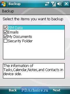 Для резервирования доступны PIM-данные, Почта, Папка «Мои Документы» и Папка «Мои секреты». Из опций есть только возможность задания автоматической перезагрузки после резервирования.