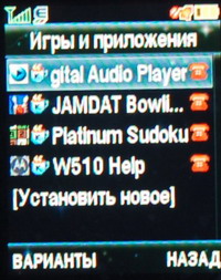 Инструменты. SIM-меню, калькулятор, календарь, будильник, службы вызовов, список активации, мировые часы. Калькулятор обычный, но наглядный. Вопросов, на какие клавиши нажимать, у вас не возникнет. Календарь приемлемый, но это не самый удобный вариант. В будильнике каждый раз отдельно можно настроить время, стиль оповещения, громкость, присвоить ему имя. В службах вызовов вы найдете фиксированный набор, голосовой набор, вызов служб, быстрый набор. Игры и приложения. DigitalAudioPlayer, JAMDAT Bowling 2, Platinum Sudoku, W510 help.