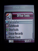 Офисные приложения. Здесь списком (а не иконками!) расположились калькулятор, календарь, ярлыки (можно назначать быстрые ярлыки к функциям телефона, а также WAP-закладки), голосовые записи (с диктофона), будильник (можно назначать несколько с разными именами и периодичностью – практически полная замена ежедневнику), чат (для любителей пообщаться), фиксированный и быстрый набор.