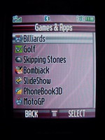Игры и приложения. В телефоне предустановленно пять игр – бильярд (очень реалистичный), гольф (интересен своей сложностью), Skipping stones (интересная логическая игра), Bombjack (что-то наподобие двухмерной бродилки, только поактивнее) и MotoGP (гонки на мотоциклах, полная версия, а не урезанная, как на телефонах Motorola начального уровня). Во все игры из-за размеров и качества экрана играть очень приятно и интересно. Огорчило только одно – при выходе из игры выходишь не в меню игр, а в режим ожидания.