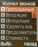 Журнал вызовов организован классическим образом – звонки разделяются на «пропущенные», «входящие» и «исходящие». Этот же раздел позволяет узнать продолжительность и стоимость разговоров и очистить память терминала.