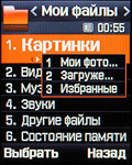 Файловый менеджер позволяет распределить файлы по категориям в том случае, если это не было сделано при копировании данных в память устройства, кроме того, с помощью этого приложения можно добавить музыку в список воспроизведения проигрывателя. В этом разделе меню собраны все файлы по типам: музыка, картинки, видео, звуки и другие файлы. Для хранения данных в аппарате есть 15 МБ встроенной памяти и поддержка карт памяти microSD. Отображаются элементы списком даже в том случае, если в настройках установлено общее отображение в виде матрицы.