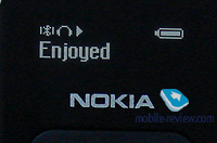 Здесь очень много клавиш, заранее скажу, что к управлению нужно привыкнуть, обязательно почитать инструкцию перед началом использования. Начну с микрофона, он располагается на правом кабеле, представляет собой маленький такой блочок, однако и тут мы можем найти интересное. Например, сплошная черная вставка является клавишей ответа/завершения вызова, а сбоку от нее есть маленький контроллер отключения микрофона, встречаюсь со специальной кнопкой для этого впервые. Пойдем дальше, к самой гарнитуре. На нижнем торце расположилась круглая пимпочка включения/выключения, занимает этот процесс несколько секунд, забудьте про другие продукты, BH-903 включается вальяжно и не торопясь, мало того, сперва на экране вы видите гордую надпись Nokia. Под кнопкой находится OLED-дисплей, это самая замечательная деталь, поясню почему. Забудьте про дисплейчик Sony-Ericsson HBH DS-970, ибо здесь функциональность переходит на совершенно новый уровень. Экран двухстрочный, вверху отображается уровень заряда аккумулятора, режим работы (радиоприемник или воспроизведение музыки), индикаторы блокировки клавиш, статуса Bluetooth, вызова (отображается и наличие не принятых вызовов, и второй входящий, это крайне удобно), режима воспроизведения (отображаются символы Play, Stop, Pause, REW и FF). Внизу мы можем видеть имя звонящего, корректно считываются как русские, так и набранные латиницей контакты вне зависимости от выбранного языка устройства. Также там отображается и название текущей композиции, название радиостанции, частота, уровень громкости, информация о том, к какому аппарату происходит подключение, и так далее, вдаваться в мелочи смысла не имеет, по ходу обзора мы еще поговорим о том, что можно увидеть на экране. Под ним расположился аж семипозиционный джойстик, даже восьми-, если брать в расчет наличие сенсорной площадки вокруг клавиши подтверждения, она находится посередине. Итак, что тут есть? По углам расположились органы управления воспроизведением, это Play/Pause, Stop, REW и FF, думаю, не стоит говорить, за что они отвечают, при подключении вы можете нажать на клавишу Play, и воспроизведение начнется без необходимости терзать смартфон. На левом и правом участках джойстика ровно посередине расположились этакие пупырышки, они служат для перемещения по меню, чтобы попасть в него, нужно нажать хромированную клавишу под джойстиком, еще ниже расположилась клавиша ответа/завершения вызова, она дублирует мелкие контроллеры на микрофоне.