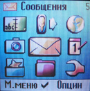 Главное меню состоит из 9 пунктов, при входе в него курсор оказывается в центре - на меню "Сообщения". Удобно, что при посещении списка посланий при наведении курсора на сообщение автоматически выпадает окошко, в котором отображаются первые 15 символов текста. Таким образом, о содержании SMS можно узнать, не открывая его. Кроме текста появляется дата и время получения сообщения.