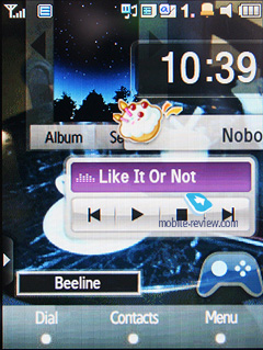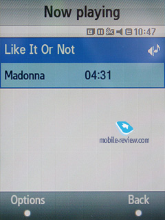 Во время проигрывания показывается номер текущей песни, общее число композиций. Эквалайзер есть, но нет никакой возможности для его настройки. Проигрывание может идти как через стереогарнитуру, так и через громкую связь. Громкость имеет 14 градаций. Пользователь может создавать свои плей-листы. Плеер работает и в фоновом режиме. В этом случае на экране отображается название композиции и подсказка к управляющим элементам, что приятно.