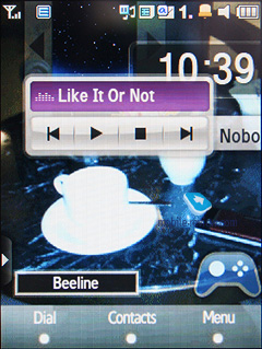 Гарнитура из комплекта имеет разъем для подключения своих наушников, обеспечивает неплохое звучание. В целом аппарат в качестве музыкального решения вполне сравним с серией Walkman от Sony Ericsson. Особенно если речь идет об аппаратах первого поколения (плеер первого поколения). Музыкальная клавиша так вообще напоминает о Walkman, она позволяет запускать и сворачивать плеер в одно касание. В режиме ожидания при свернутом плеере отображаются элементы его управления и название текущей композиции.