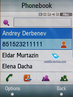Сортировка записей на различных языках осуществляется по порядку: сначала все контакты на локальном языке (к примеру, русском), затем все имена на английском. Это достаточно удобно и привычно по компьютерным программам. Учитывая возможность быстрого переключения языка при поиске, становится ясно, что записи на различных языках не составляют проблемы в этом аппарате. Сортировка списка по имени или фамилии присутствует.