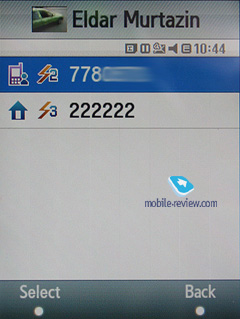 В строке под именем показывается номер по умолчанию, вы можете выбрать его самостоятельно из занесенных в память телефона номеров. Предусмотрен быстрый поиск имени по первым буквам, в этом аппарате их может быть до двадцати, причем для любого языка. Нажав на имя, вы попадете в меню просмотра отдельной записи, тут отображается небольшая иконка, если изображение соотнесено с именем. В качестве картинки имени может выступать любой графический файл, а также ваши фотографии или видео. Для имени можно записать до 5 номеров телефонов различных типов (мобильный, офисный, домашний, факс, другое), один из них будет основным (по умолчанию – первый введенный). Поля не фиксированы. Из меню телефона можно ввести дополнительные поля, например, адрес электронной почты, обычный адрес и так далее.