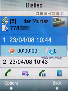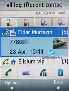 В каждом из списков указывается до 30 номеров телефонов. Есть объединенный список последних звонков (всего 90 записей), здесь иконка отмечает тип звонка. Можно быстро переходить из одного списка в другой. Для отдельной записи при подробном просмотре можно видеть дату и время звонка. Одинаковые звонки суммируются, напротив номера показывается их число. Традиционно в этом меню можно увидеть общее время всех звонков и их стоимость (если услуга настроена).