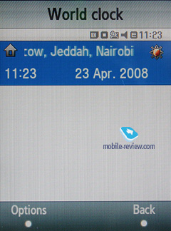 В телефоне всего пять будильников, каждый можно выставить на определенные дни недели. Для всех есть выбор из 5 мелодий, но можно использовать и mp3. В настройках можно указать, будет ли телефон включаться автоматически при наступлении события или нет.
