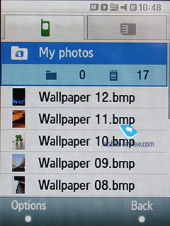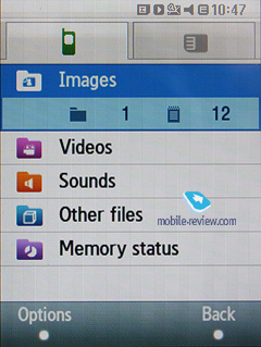 Поддерживается отображение файлов как в виде списка, так и в виде иконок. Можно выбирать как один, так и несколько файлов из списка. Поддерживаются такие файловые операции, как копирование, удаление, перенос файлов (память телефона, карта памяти). Сортировка файлов может происходить как по времени, так и по типу, имени, размеру.