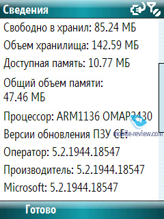 Объем доступной для работы операционной системы оперативной памяти равен 47 Мб (из 64 Мб). Из этого объема пользователю для запуска программ остается примерно 15 Мб. В нашем аппарате такой объем памяти, скорее всего, по причине того, что устройство тестовое. Возможно, в будущих прошивках объем свободной памяти будет увеличен до привычных 20-25 Мб.
