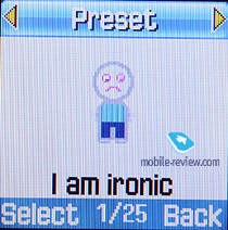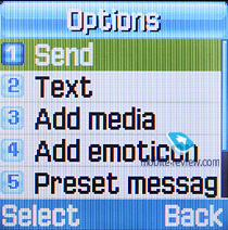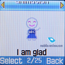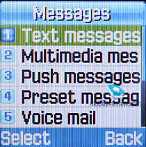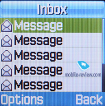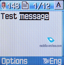 Сообщения. В памяти аппарата может храниться до 200 сообщений. Аппарат поддерживает стандарт EMS, в памяти телефона уже предустановлен набор небольших картинок, анимаций и мелодий. Кроме этого, в аппарате есть набор эмотиконов, они пригодятся, если у человека, которому отправляется сообщение, на аппарате нет поддержки EMS. Есть возможность создать до 10 собственных шаблонов. Нажатие на правую функциональную клавишу во время набора сообщения позволяет изменить режим и язык ввода. Аппарат поддерживает предикативный ввод текста Т9.