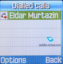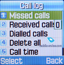 Список звонков. Стандартные списки (до 20 номеров в каждом) принятых, набранных и пропущенных звонков. Звонки с одинаковых номеров не суммируются, а отображаются отдельно. По нажатию на имя/номер отображается сам номер телефона, дата и время звонка. В этом же разделе находятся счетчики разговоров.