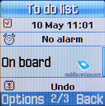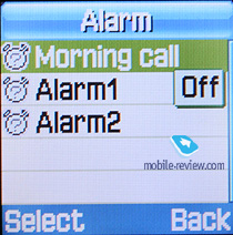 Органайзер. Будильник. В аппарате 3 независимых будильника: одиночный, ежедневный и утренний. Для каждого из них можно установить свою мелодию. Будильники можно установить на определенные дни недели.