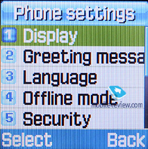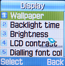 Настройки. Здесь находятся стандартные настройки телефона. Тут можно установить обои экрана, в их роли может выступить одна из 5 предустановленных картинок или картинка, загруженная пользователем. Также для дисплея можно настроить яркость и контрастность. Здесь же можно выбрать цвет цифр при наборе номера.
