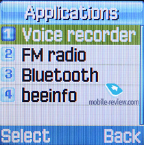 Приложения. Диктофон позволяет делать записи как в режиме ожидания, так и во время разговора (активация только через меню). Продолжительность записи ограничена свободной памятью, максимально она может составить до 39 минут.