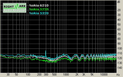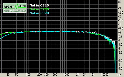 Признаюсь честно, что это не то устройство, про которое стоило бы рассказывать в аспекте музыки, на корпусе есть разъем 2.5 мм, в комплект входят не очень хорошие для прослушивания наушники. Другое дело, что если подключить свои наушники через переходник, звук становится лучше и значительно. Мне это показалось необычным, и мы провели инструментальные замеры в RMAA. Для сравнения взяли музыкальный смартфон Nokia 5320 XpressMusic и Nokia 5220 XpressMusic как представителя платформы S40. Удивительно, но результат оказался весьма и весьма необычным. В частности, разницы между Nokia 5320 и Nokia 6210 Navigator по качеству звучания почти нет, все на уровне статистической погрешности, модель Nokia 5220 звучит субъективно также, но имеет лучшее соотношение сигнал/шум. Это прекрасная демонстрация универсализации платформы для продуктов S60. Получается, что в ряде случаев наличие AIC33 выпячивается, получаются «музыкальные» модели с разъемом 3.5 мм, пультом управления, а в ряде случаев о нем не говорят, хотя звучание аппаратов одинаково. Понятно, что программно плеер характерен для платформы, желающих ознакомиться с ним приглашаем в соответствующий материал.