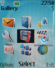 Этот аппарат, как и большинство других бюджетных решений, построен на платформе S40 5-го издания Light Edition. Главное меню аппарата может быть представлено в виде вертикального списка, рядом с названием пункта меню слева присутствует небольшая иконка. Второй и более привычный тип представления меню - матрицы 3х3. Некоторые подменю могут быть представлены в виде вертикальных списков с крупными иконками, с мелкими значками или в виде матрицы иконок. При перемещении по меню никаких видимых притормаживаний нет. В меню телефона есть быстрая навигация с помощью цифровых последовательностей, кроме этого, есть функция «Go To», которая представляет из себя список часто используемых задач, которые пользователь вправе удалять и добавлять самостоятельно. Также имеется возможность назначить доступ к нужным пунктам меню из режима ожидания на нажатия правой и левой функциональной клавиши, а также навигационной клавиши.