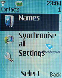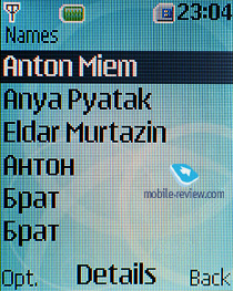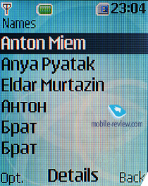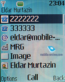 В телефоне имеется быстрый набор до 8 номеров. Контакты можно перемещать с SIM-карты в телефонную книгу и обратно. Поиск в телефонной книге осуществляется по первым буквам имени. Контакты в списке могут отображаться одним из трех способов: только в виде имени и фамилии, в виде имени и фамилии с номером мобильного телефона, а также именем и фамилией с небольшой мини-картинкой, присвоенной контакту.