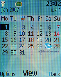Календарь. Возможен просмотр событий как за месяц, так и за неделю с разбивкой по часам. Кроме этого, можно просмотреть список всех событий. Для отдельного события можно выбрать его тип (встреча, звонок, день рождения, заметка, напомнить), записать тему (до 160 символов), место (до 50 символов), дату и время начала и окончания. Также для события можно выбрать звуковой сигнал оповещения и время предварительного напоминания.