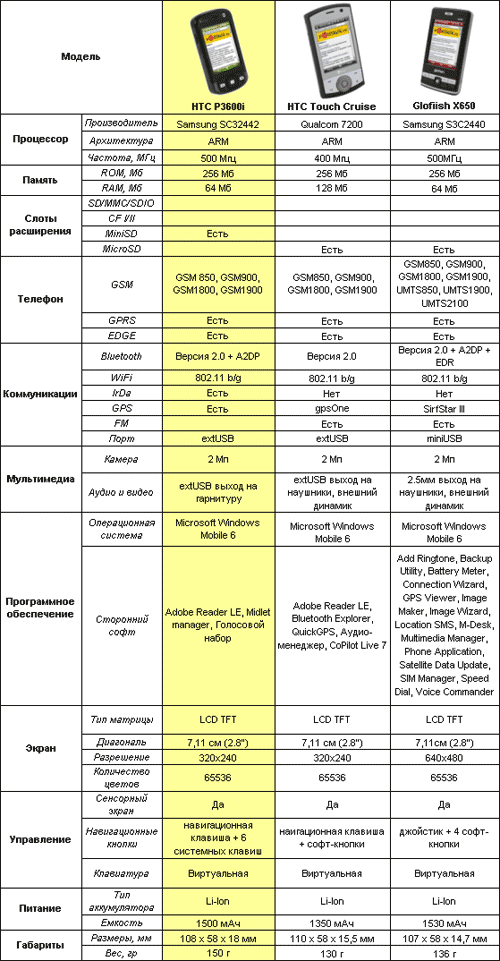 Ниже приводятся таблица сравнения технических характеристик коммуникаторов HTC P3600i, HTC Touch Cruise и Glofiish X650.