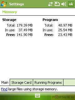 Объем оперативной памяти после первого включения аппарата составляет 64 Мб, из которых доступно всего 23 Мб — на сегодняшний день, конечно, немного. Но зато размер флэш-памяти равняется 256 Мб, пользователю под приложения выделено около 140 Мб. Расширить память можно за счет карт памяти формата miniSD.