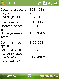 Для тестирования на предмет возможности HTC P3600i проигрывать видео нами использовался плеер TCPMP. Тест проходили два ролика: один отконвертированный, с разрешением 320x240, а второй — оригинальный, с разрешением 672x288 точек. Отличным результатом, как известно, считаются 120%.