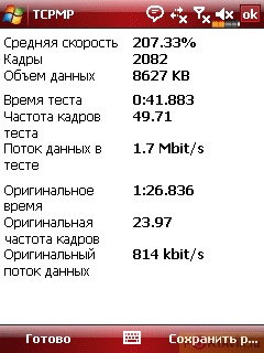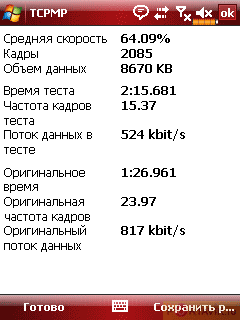 Для проверки возможностей воспроизведения видео берем TCPMP-плеер и проигрываем два ролика: оригинальный (672 x 288 пикселей) и конвертированный (320 x 240 пикселей). Напоминаем, что отличным результатом будет 120%.