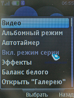 Видео. Аппарат позволяет записывать видео в формате 3GP, разрешение роликов – 128х96 точек либо 176х144 точки. Качество записи также варьируется по трем параметрам. Можно ограничить продолжительность записи, но она может быть и максимальной, пока хватит памяти карты или аппарата. Эффекты могут быть применены для видео точно так же, как и для фотографий, их количество совпадает.